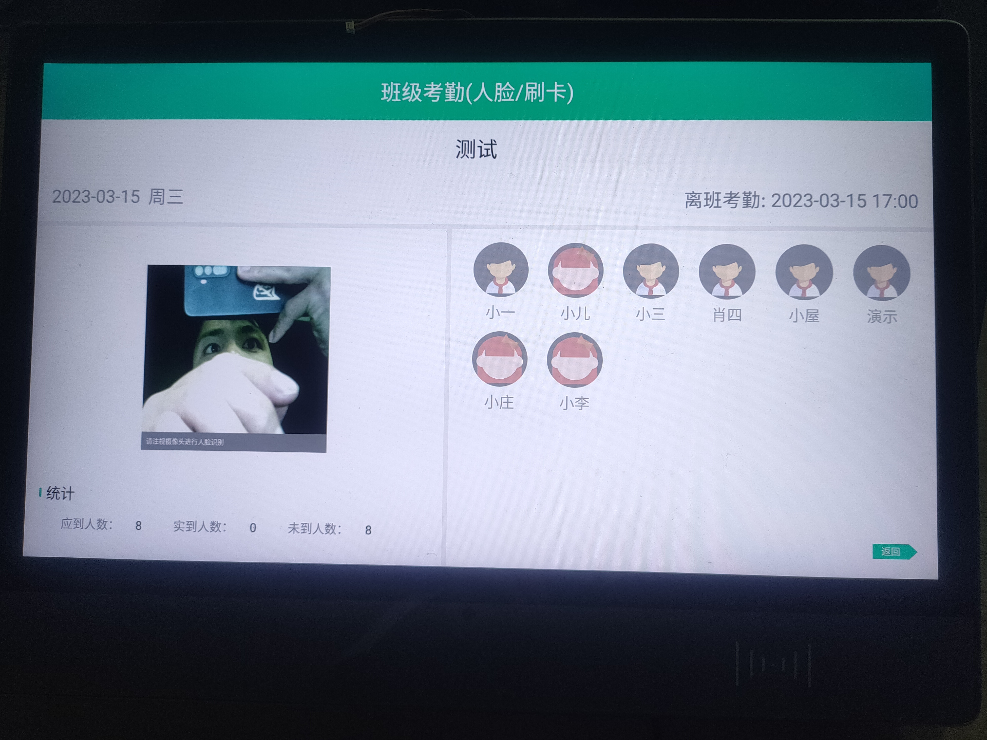- 打卡界面显示当前是进班打卡还是离班打卡(显示‘查询设备考勤班次接口’返回的scheduleName),以及相关统计信息:应到人数,实到人数,未到人数(查询考勤班级人数统计接口)