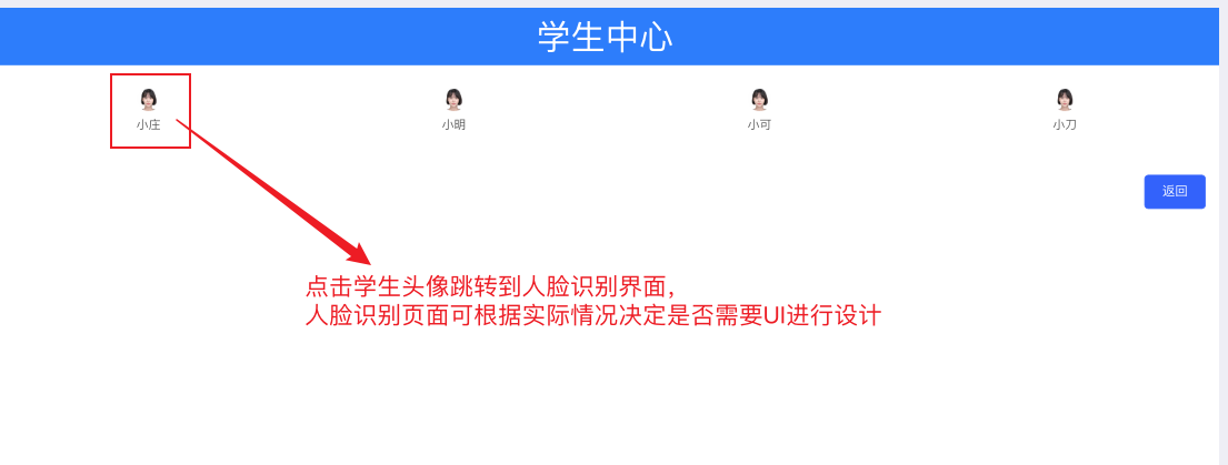 - 点击学生头像跳转到人脸识别页面,人脸识别页面样式可根据实际情况决定是否需要UI进行设计;