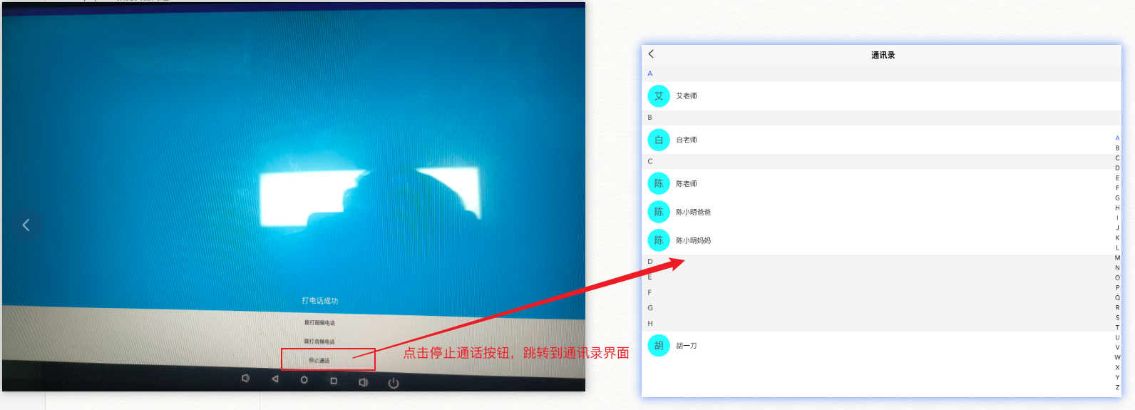 - 停止通话:点击停止通话按钮,停止当前通话,返回通讯录页面(停止通话后需要调用班牌服务端接口(更新通话状态-已结束)更新通话状态为结束)。