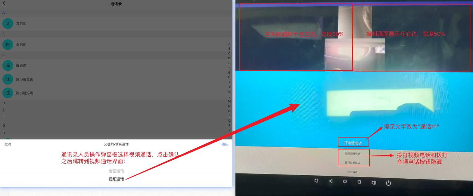- 视频通话页面修改点1:主叫和被叫视频窗口左右分布,各占宽度50%; 修改点2:通话界面上的“打电话成功”提示语改为“通话中”; 修改点3:拨打视频电话和拨打语音电话按钮隐藏掉。